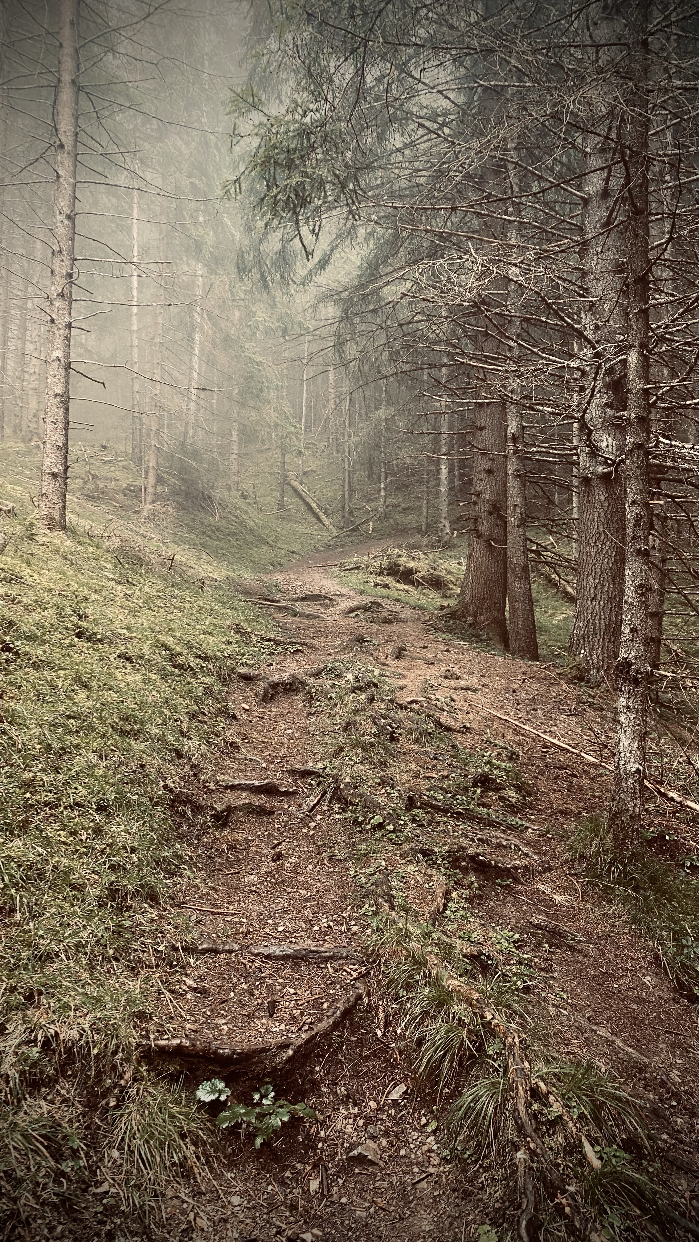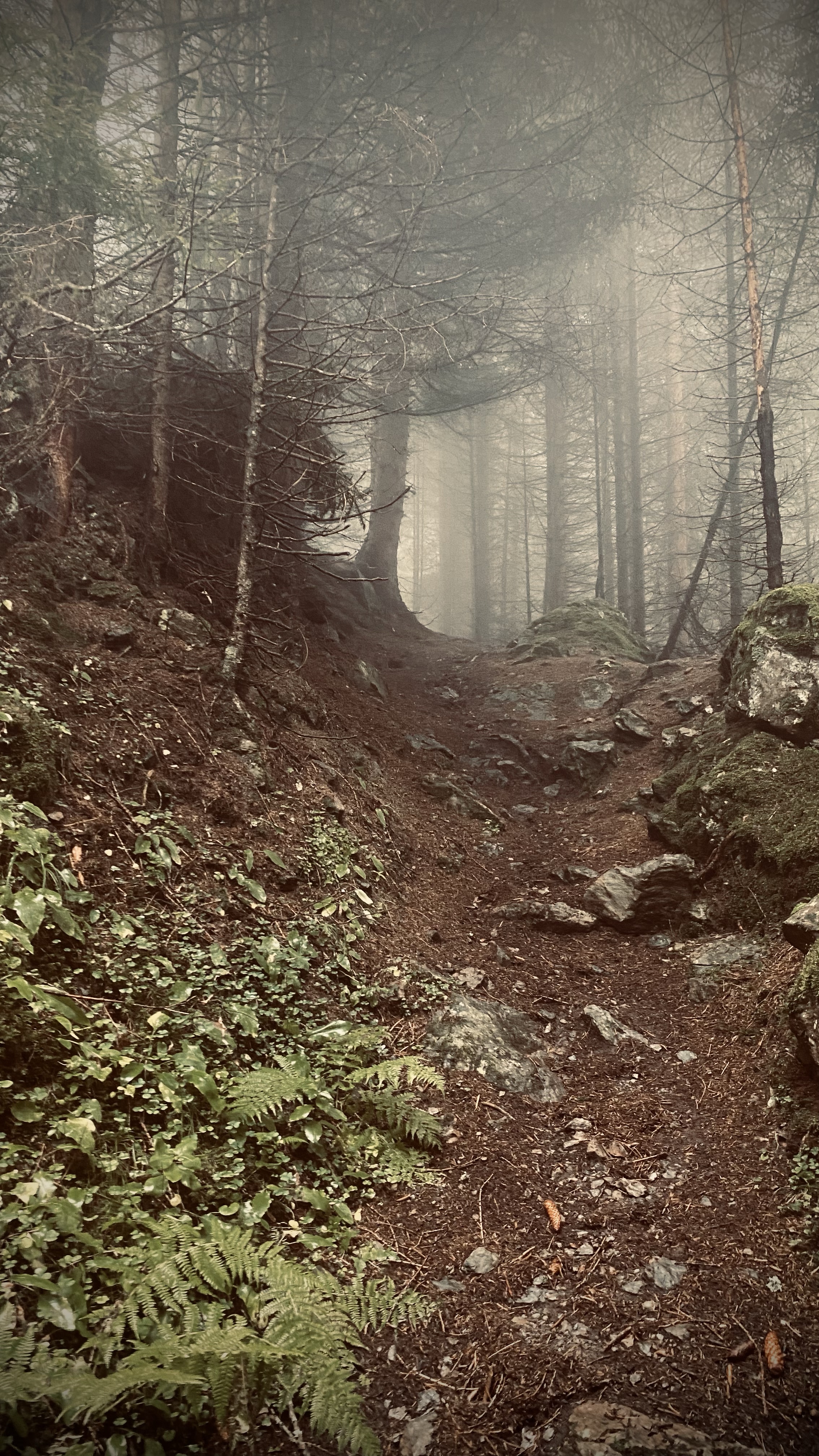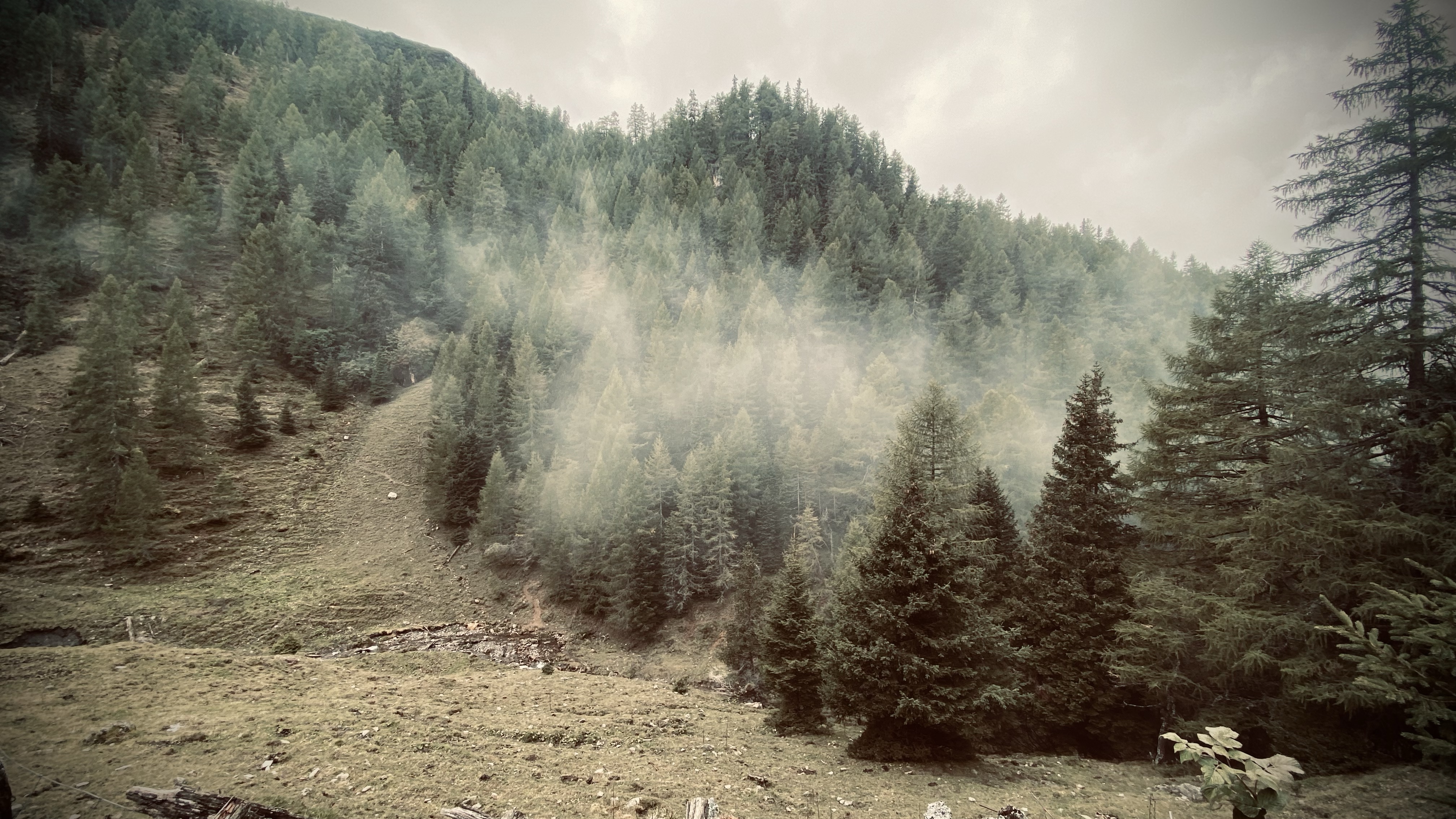 Nach der kleinen Stärkung ging es dann auch schon weiter am Lichtsee vorbei auf dem Wanderweg 125 Richtung Obernberg, unserem heutigen Ziel. Sonne und dichter Nebel wechselten sich ständig ab, während wir mal durch niedrige Kieferngewächse, Sträucher oder Lärchenwälder dem teilweise sehr steilen Pfad talabwärts folgten. Wölfen oder Luchsen sind wir nicht begegnet, einem Bären auch nicht, aber gewundert hätte es mich nicht. Die Natur wirkte so unberührt, wild und abgelegen von jeglicher Zivilisation, dass Ginger und vor allem ich eher fremd am Platz wirkten. Da der Wanderweg steil und durch Steine und Wurzeln sehr uneben ist, kann ich nur empfehlen, Stecken zur Hilfe zu nehmen. Ich hatte sie diesmal auch dabei und nicht am Rucksack, sondern dankbar in den Händen.
