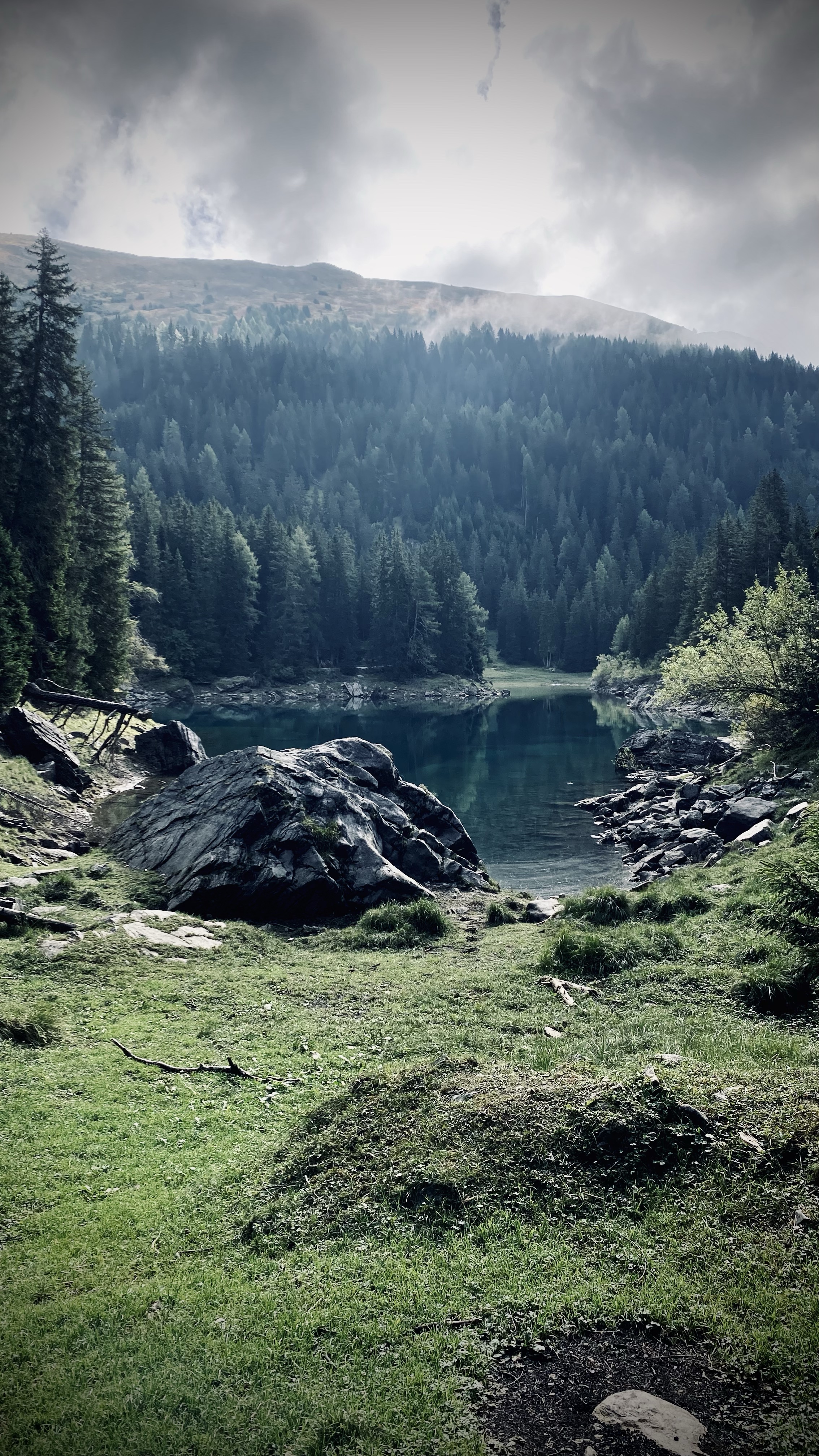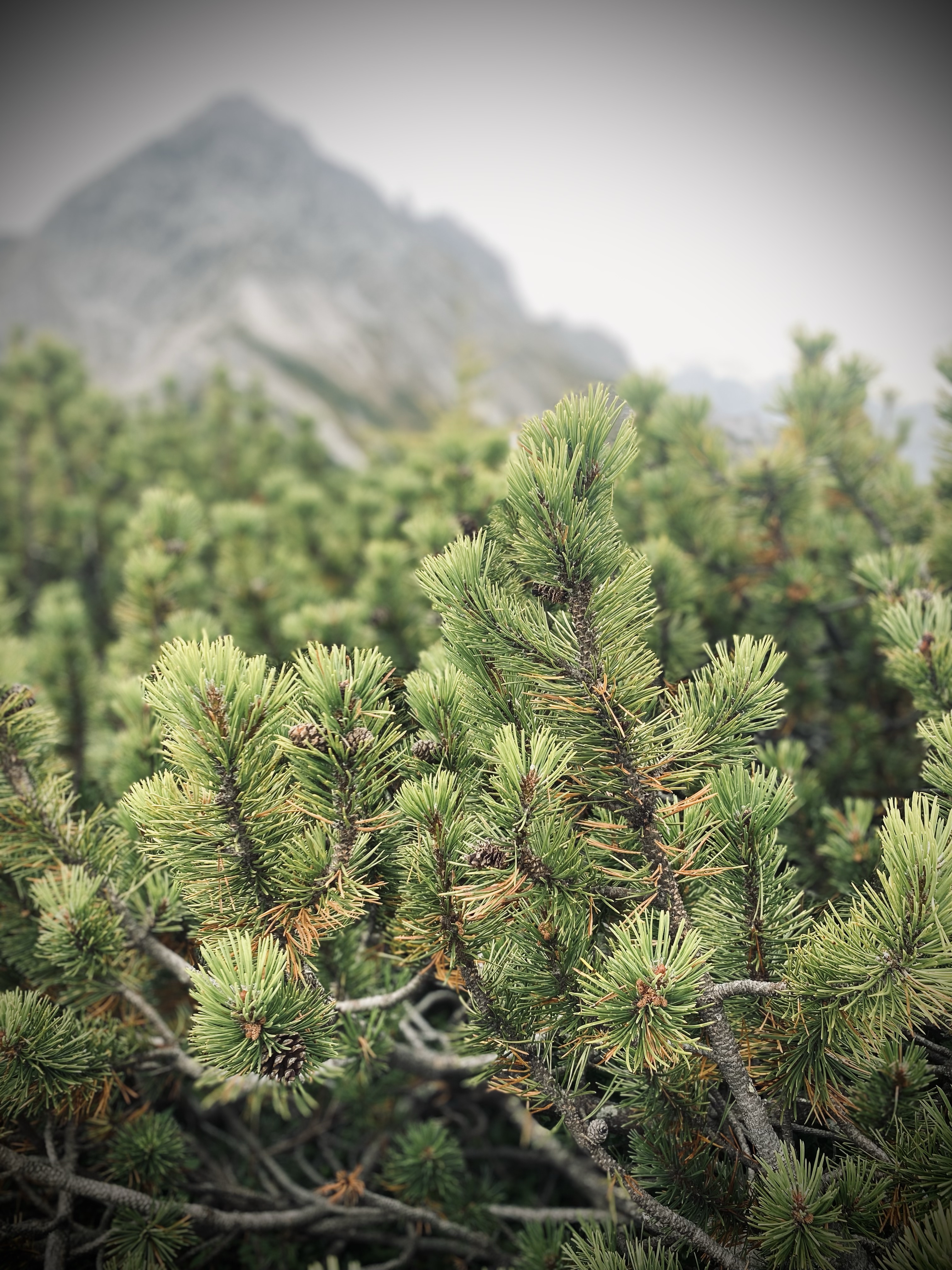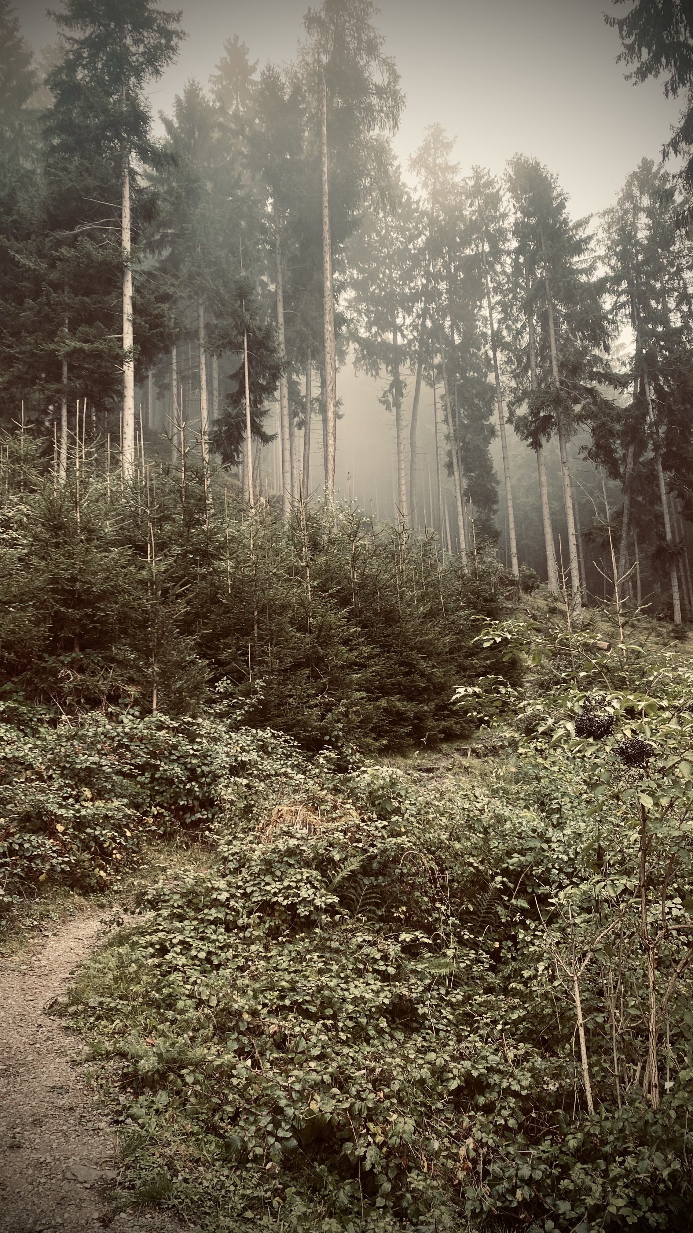 Nach der kleinen Stärkung ging es dann auch schon weiter am Lichtsee vorbei auf dem Wanderweg 125 Richtung Obernberg, unserem heutigen Ziel. Sonne und dichter Nebel wechselten sich ständig ab, während wir mal durch niedrige Kieferngewächse, Sträucher oder Lärchenwälder dem teilweise sehr steilen Pfad talabwärts folgten. Wölfen oder Luchsen sind wir nicht begegnet, einem Bären auch nicht, aber gewundert hätte es mich nicht. Die Natur wirkte so unberührt, wild und abgelegen von jeglicher Zivilisation, dass Ginger und vor allem ich eher fremd am Platz wirkten. Da der Wanderweg steil und durch Steine und Wurzeln sehr uneben ist, kann ich nur empfehlen, Stecken zur Hilfe zu nehmen. Ich hatte sie diesmal auch dabei und nicht am Rucksack, sondern dankbar in den Händen.
