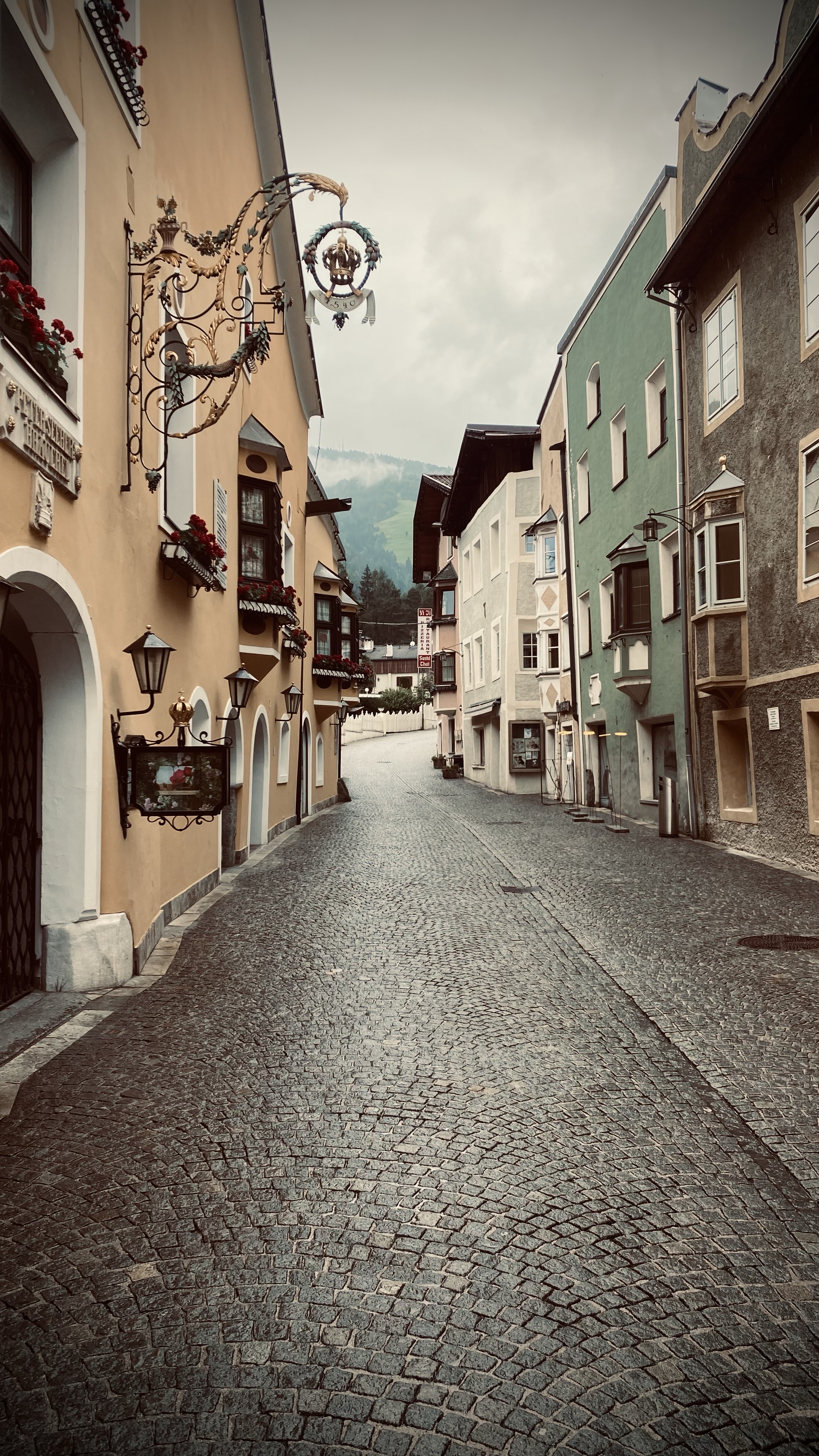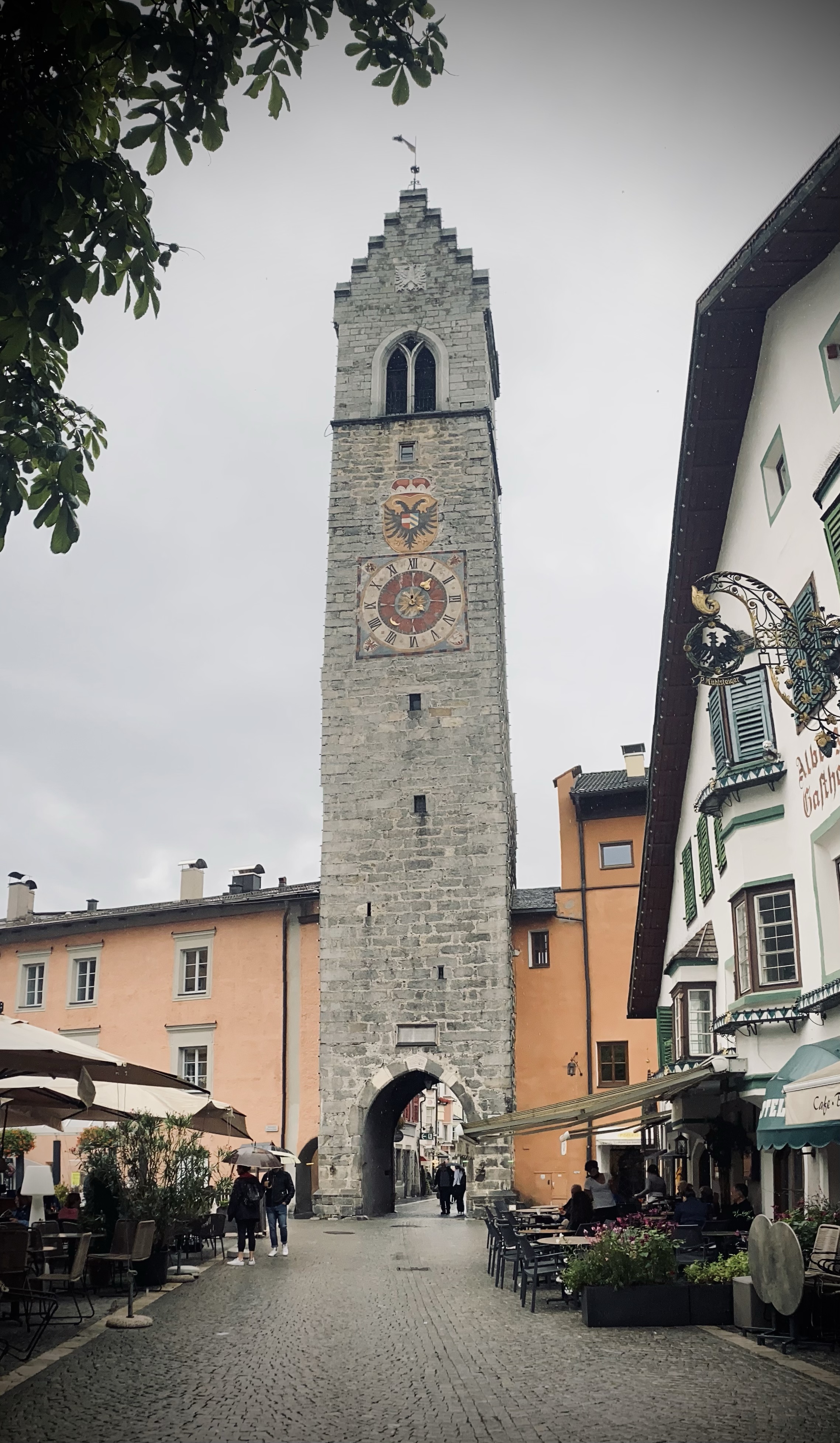 In Sterzing angekommen, nutzte ich die Wartezeit, bis der Bus zurück ins Hotel fuhr und schlenderte mit Ginger trotz Nieselregen einmal durch die Fußgängerzone. Zwar waren die Geschäfte geschlossen, aber ein heißer Cappuccino mit einem Teilchen musste trotz kalter Finger und nasser Kleidung einfach sein.