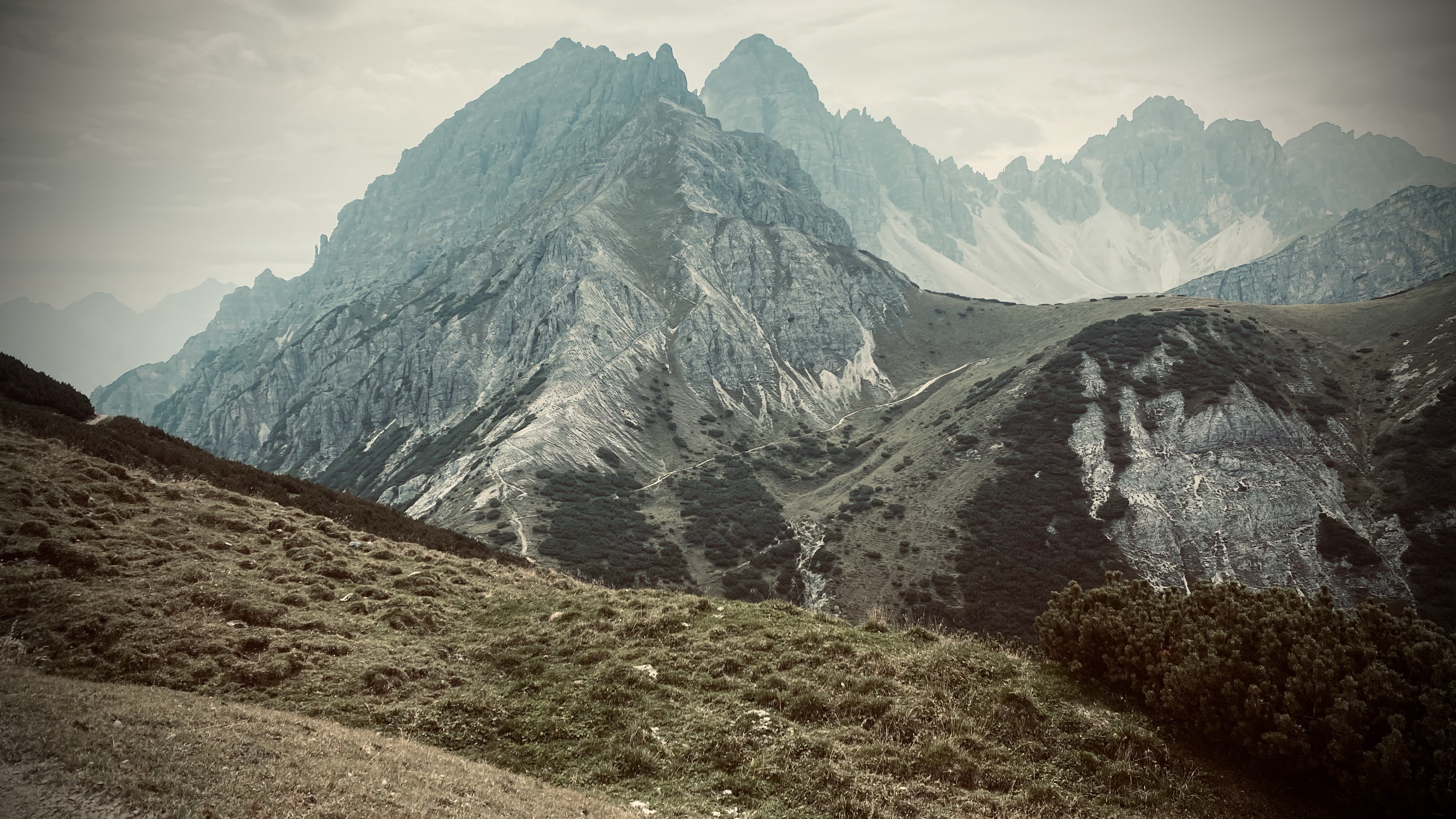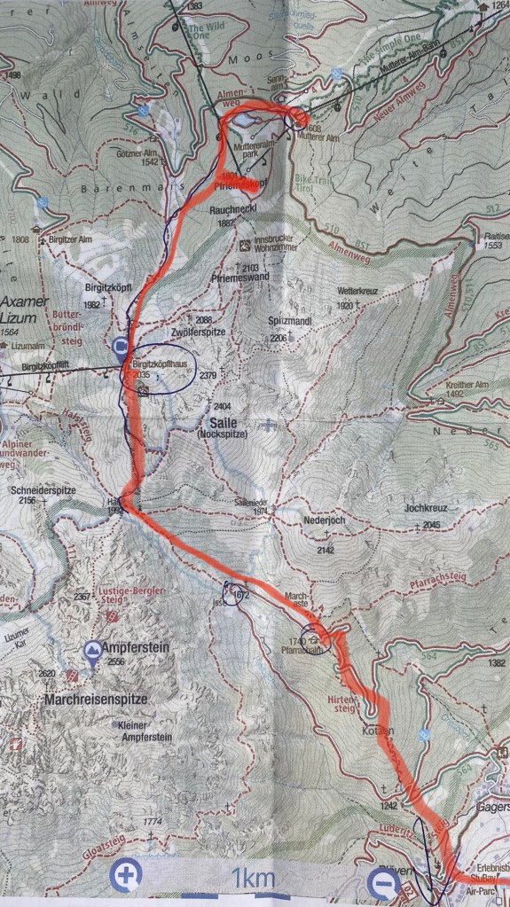 Vom Hotel aus ging es vorbei an der Kirche quer durch das hübsche Dorf zur Muttereralmbahn. Die Fahrt zur Bergstation dauerte etwa 12 Minuten. Es waren kaum Touristen unterwegs, keine Warteschlange, keine Menschenansammlungen – herrlich. Oben angekommen ging es dann den Schildern nach Richtung Birgitzköpfhaus. Auf dem Weg machten Ginger und ich einen etwa 40-minütigen Abstecher zur Primeswand hinauf, deren Gipfelkreuz bei 2103 Metern steht. Zwar war es heut wolkig und die Sicht getrübt, nichtsdestotrotz war der Ausblick herrlich. Nach einer kleinen Verschnaufpause, denn bis hier her ging es immer steil bergauf, machten wir uns wieder auf den Rückweg, um auf unserer eigentlichen Route weiterzulaufen. Stöcke sind auf diesem Abschnitt wirklich empfehlenswert und zwar in den Händen und nicht gut verzurrt am Rucksack, wie es bei mir heute der Fall war. Viel Geröll, loses Gestein und Wurzeln machten den Weg zu einer wahren Stolperfalle. Außerdem war der Steig streckenweise sehr schmal mit einer nicht unerheblichen Hanglage zur Rechten. Die Landschaft hier war jetzt schon deutlich karger – die massiven Gebirgshänge beeindruckend und majestätisch.