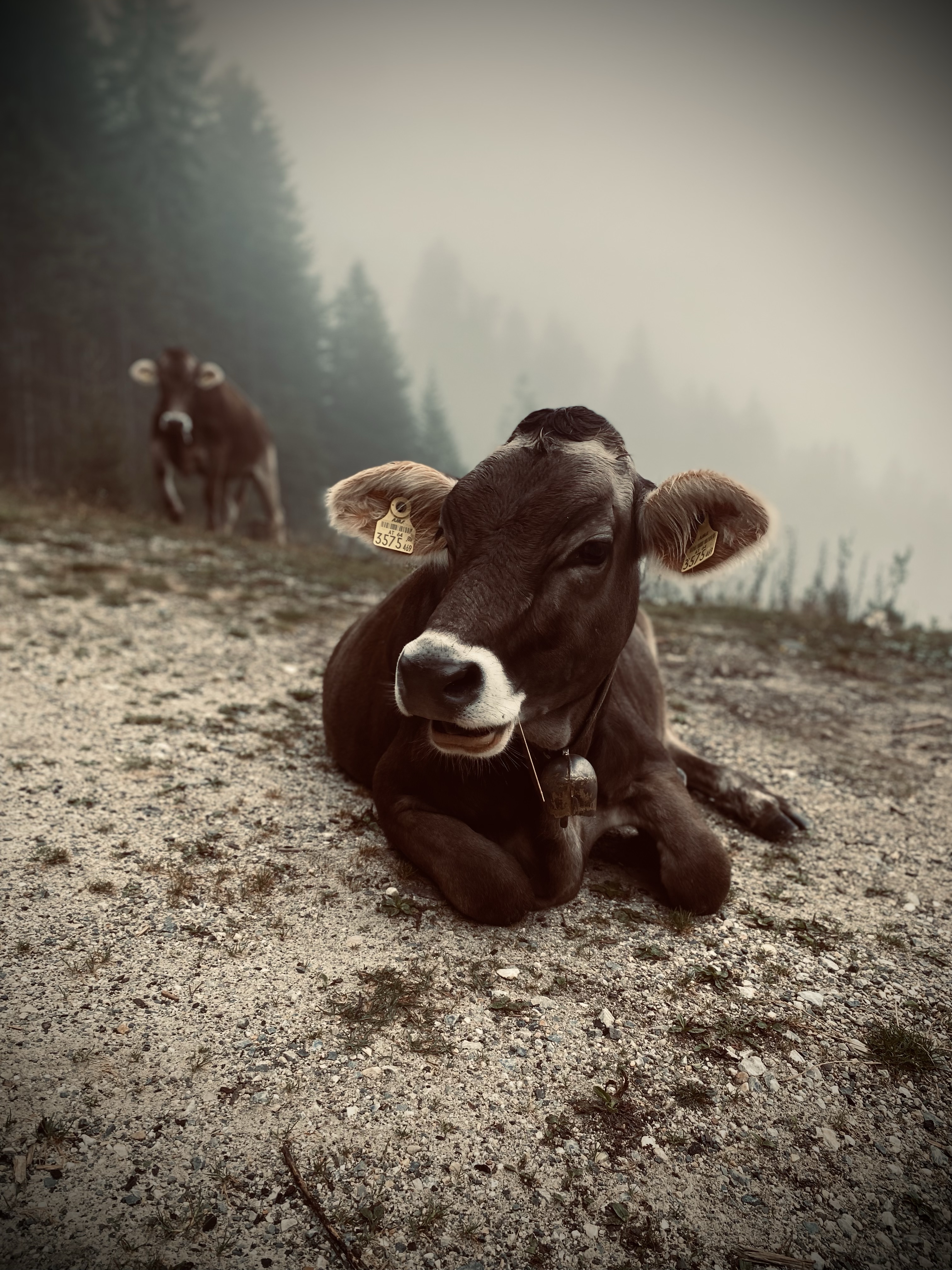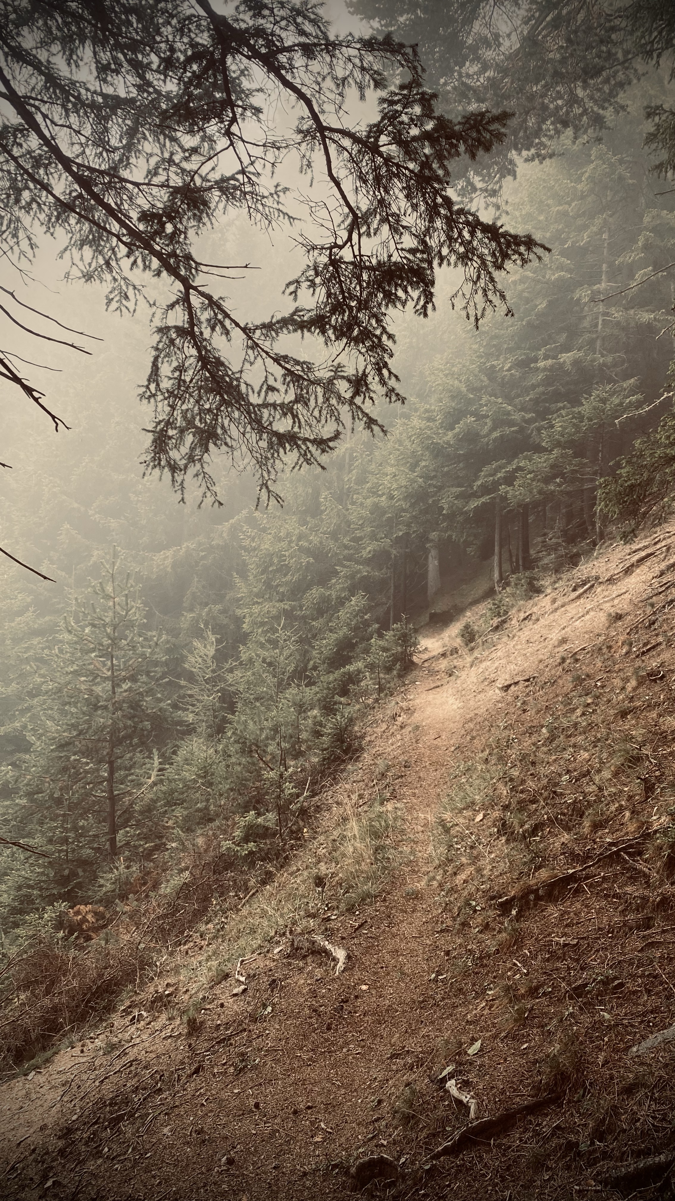 Der Aufstieg bis zur Bergstation hat etwa 70 Minuten gedauert, brachte 620 Höhenmeter und ca. 4,5 Kilometer Strecke mit sich. Der in den Bäumen hängende Nebel ließ heute eine ganz neue Stimmung aufkommen-alles war besonders still, friedlich, aber auch geheimnisvoll. Menschen sind wir so gut wie gar nicht begegnet, dafür aber den gesamten Tag über immer wieder Jungbullen, die in kleinen Gruppen mitten im Wald Rast machten oder auf abgelegenen Lichtungen grasten.