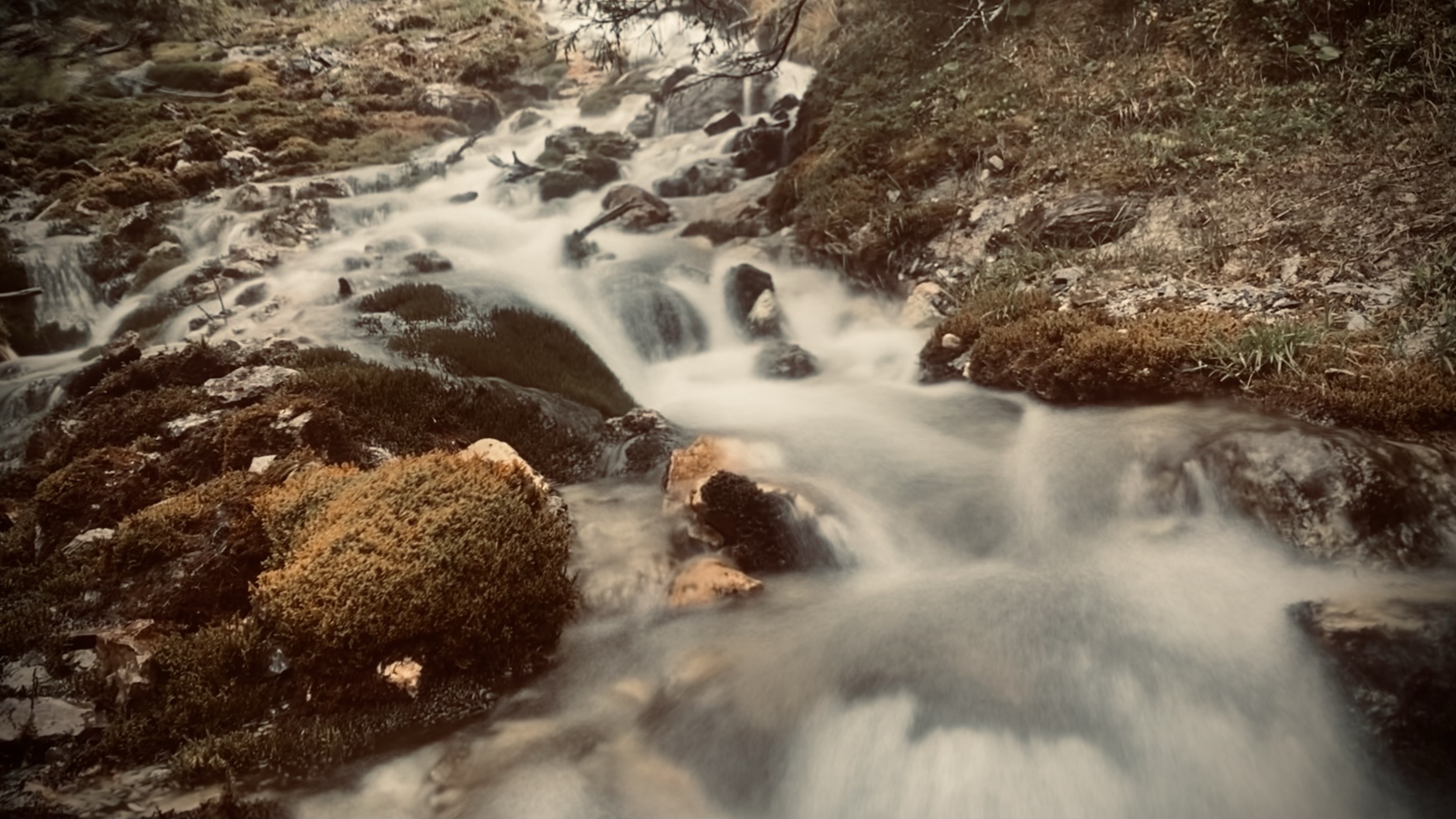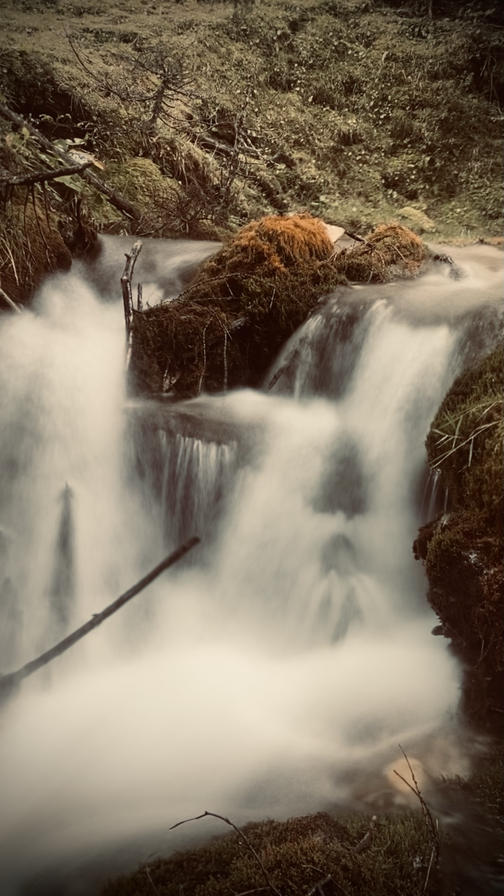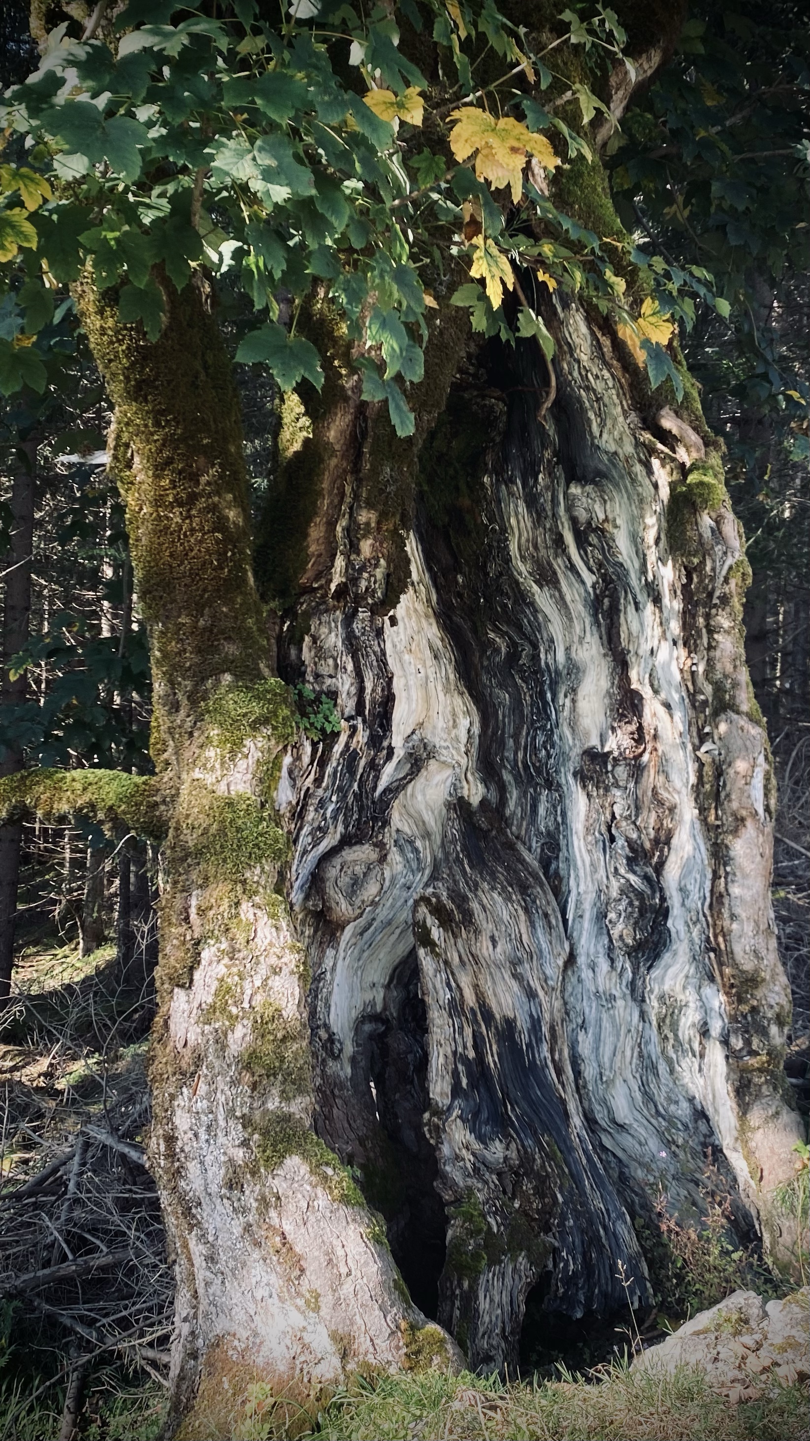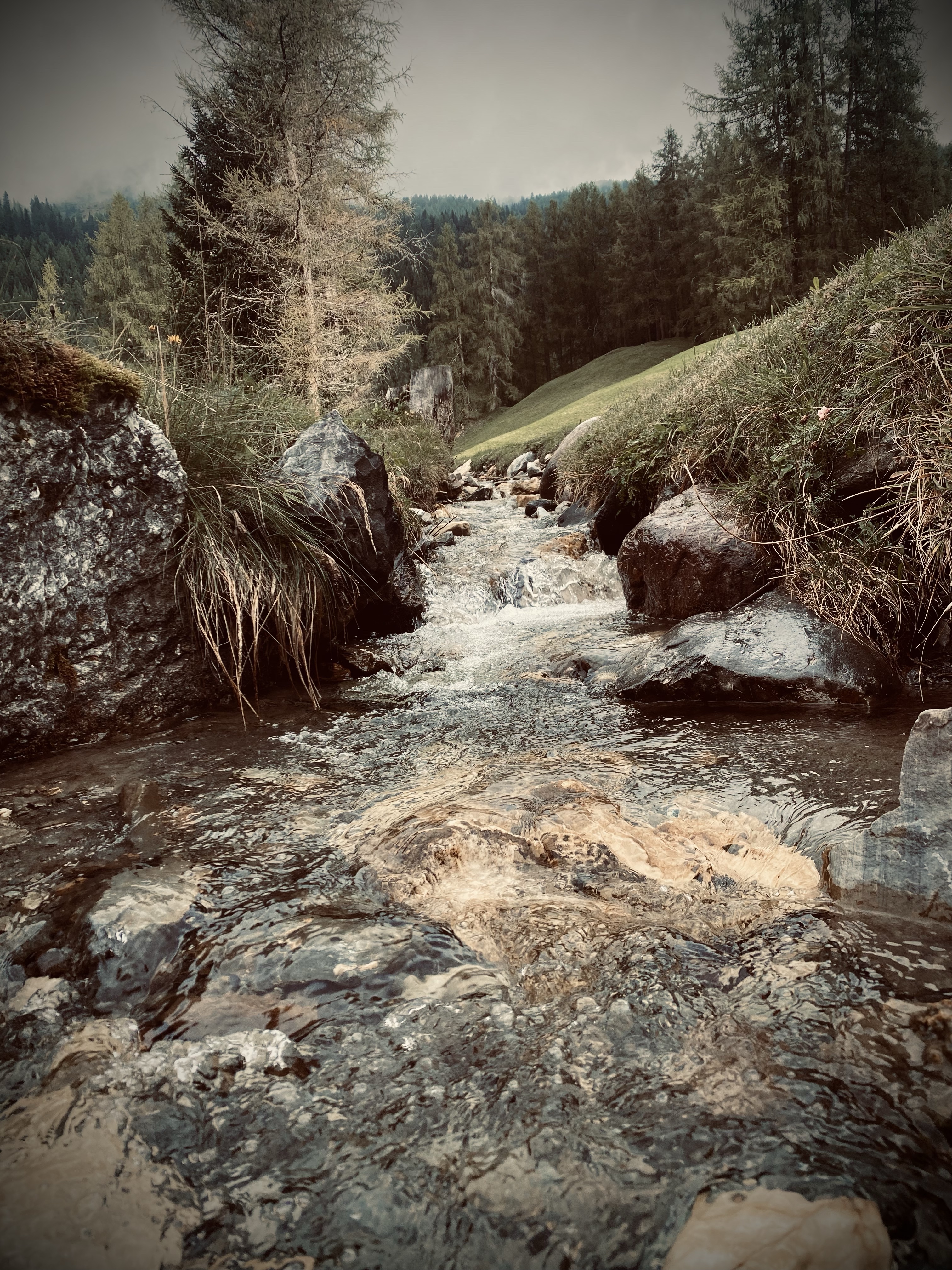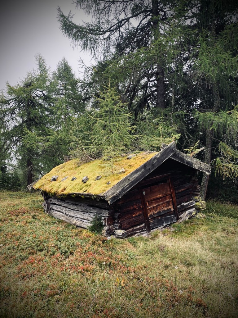 Ab hier ging es stetig in einer angenehmen Steigung einen Waldpfad hinauf, der mal aus weichem, mit Kiefernnadeln übersäten Waldboden und mal aus felsigem und verwurzeltem Untergrund bestand. Nach einiger Zeit stießen wir auf einen Forstweg, dem wir aber nur wenige Meter folgten, um dann gleich wieder auf den Steig hangaufwärts abzubiegen- immer weiter Richtung Vallmingalm. Der Waldweg führte vorbei an moosbewachsenen Felsen, alten knorrigen Kiefern und der einen oder anderen Ruine aus alten Zeiten und endete schließlich auf einen weiteren Forstweg. Dem folgten wir nur begleitet vom Rauschen des Baches rechts von uns, bis wir in Höhe der Waldgrenze vom Geläut der Kuhglocken begrüßt wurden.