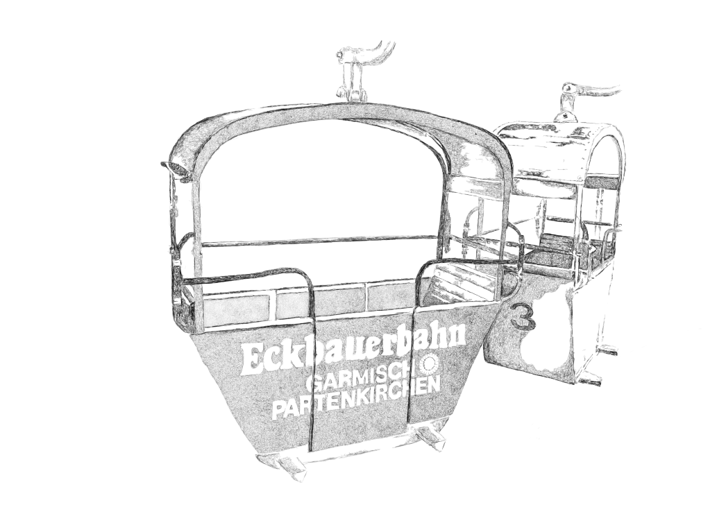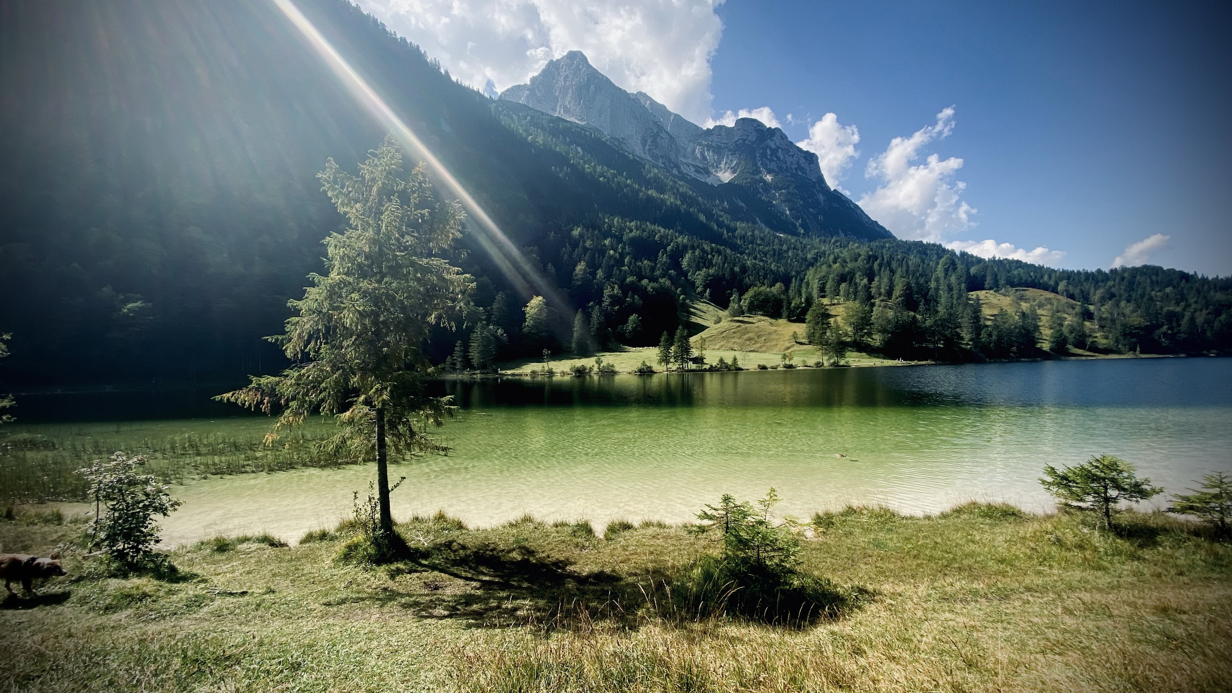 Es ist Montag Abend und ich liege mit müden Beinen, aber einem seligen Lächeln auf meinem schmalen Bett und lasse den Tag noch einmal Revue passieren. Das Wetter war herrlich und die Ausblicke auf Seen und Berge traumhaft. Angefangen hat diese Etappe mit einer Fahrt mit der Eckbauer-Seilbahn. Obwohl ich nun schon so lange im Werdenfelser Land lebe, bin ich doch weder mit der alten, noch mit der neuen Eckbauerbahn zuvor gefahren. Eine Premiere also – absolut schön und empfehlenswert. Danach ging es für uns weiter Richtung Schloss Elmau. Es waren kaum andere Wanderer unterwegs – lediglich ein paar interessierte Jungbullen stellten sich uns in den Weg. Und so konnten wir den grandiosen Blick über Stegreif, Wettersteingebirge und Schloss Elmau in ungestörter Ruhe genießen. Das Hotel dort scheint gut besucht zu sein – zumindest waren ab hier bis hin zum Ferchensee jede Menge Wanderer und Radlfahrer entlang dem Ferchenbach unterwegs.