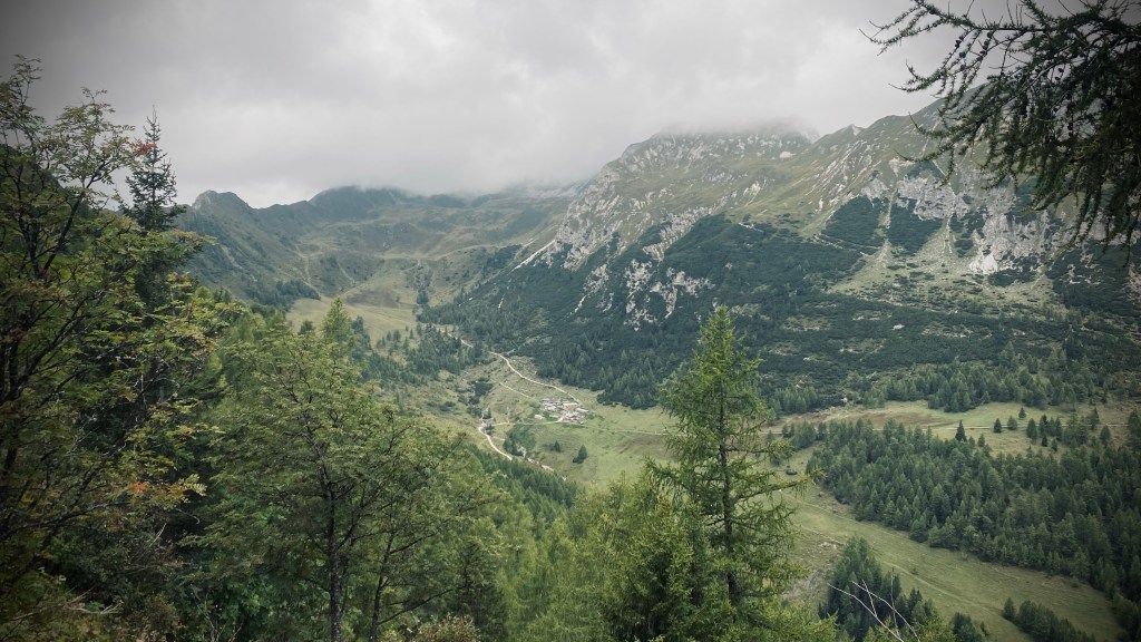 Dafür mussten wir wieder ein Stück den Weg zurückgehen und dann auf den Dolomieu-6 Almenweg nach rechts abbiegen. Er führt in leichten Bögen direkt zum Plateau und zur Bergstation und besteht zum Teil aus groben Holzstufen oder gut begehbarem Waldweg. Noch begleitete uns die Sonne und so beschloss ich noch einen kleinen Abstecher auf den Monté Cavallo zu wagen. Leider schlug das Wetter auf halbem Wege innerhalb kürzester Zeit um und so mussten wir schweren Herzens umdrehen und uns zügig auf den Weg zur Bergbahn machen, die uns dann bei heftigem Regen und Wind ins Tal nach Sterzing brachte.