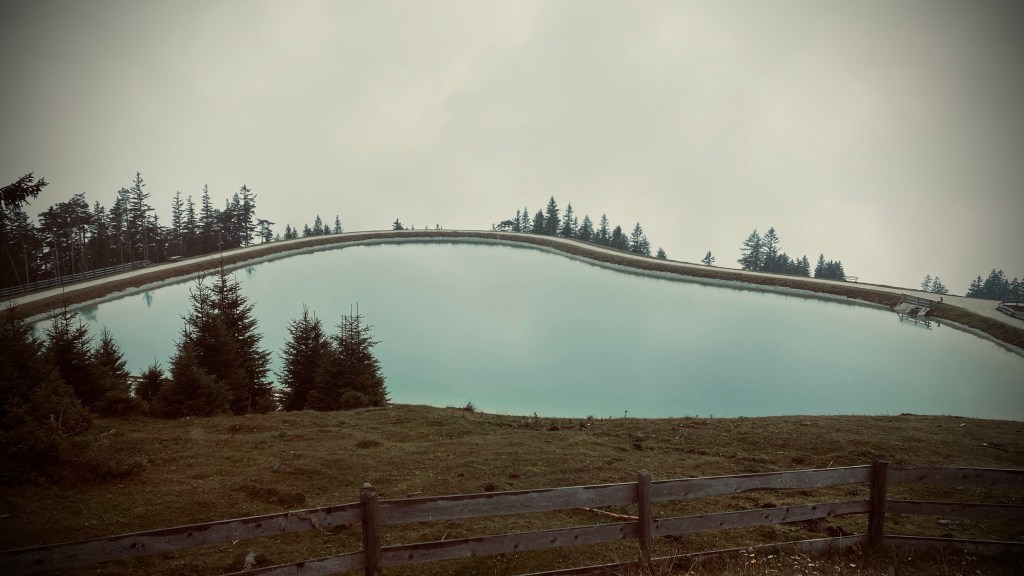 An der Bergstation angekommen, hält man sich rechts, passiert das Restaurant Hochserles, dann einen wunderschön angelegten Wasserspeicher und erreicht schließlich einen Forstweg. Diesem folgt man ein kurzes Stück und biegt dann nach rechts auf den Kapellenweg Maria Waldrast ein. Dieser führt nach ca. einer Stunde Marsch direkt bis zu dem höchstgelegen Wallfahrtskloster Europas: Maria Waldrast. Man sagt, eine Einkehr an diesem geschichtsträchtigen Ort ist sozusagen ein Gebot und bei besserem Wetter hätte ich das sicher auch getan. Heute ging das jedoch leider nicht, denn leichter Nieselregen hatte mich mittlerweile schon ziemlich durchnässt und Kleidung zum Wechseln hatte ich sinnvollerweise nicht dabei – also gab es nur einen kurzen Blick links und rechts und wieder ab in den Wald, auf die noch zum Glück unbefahrene Rodelbahn weiter Richtung Trins.