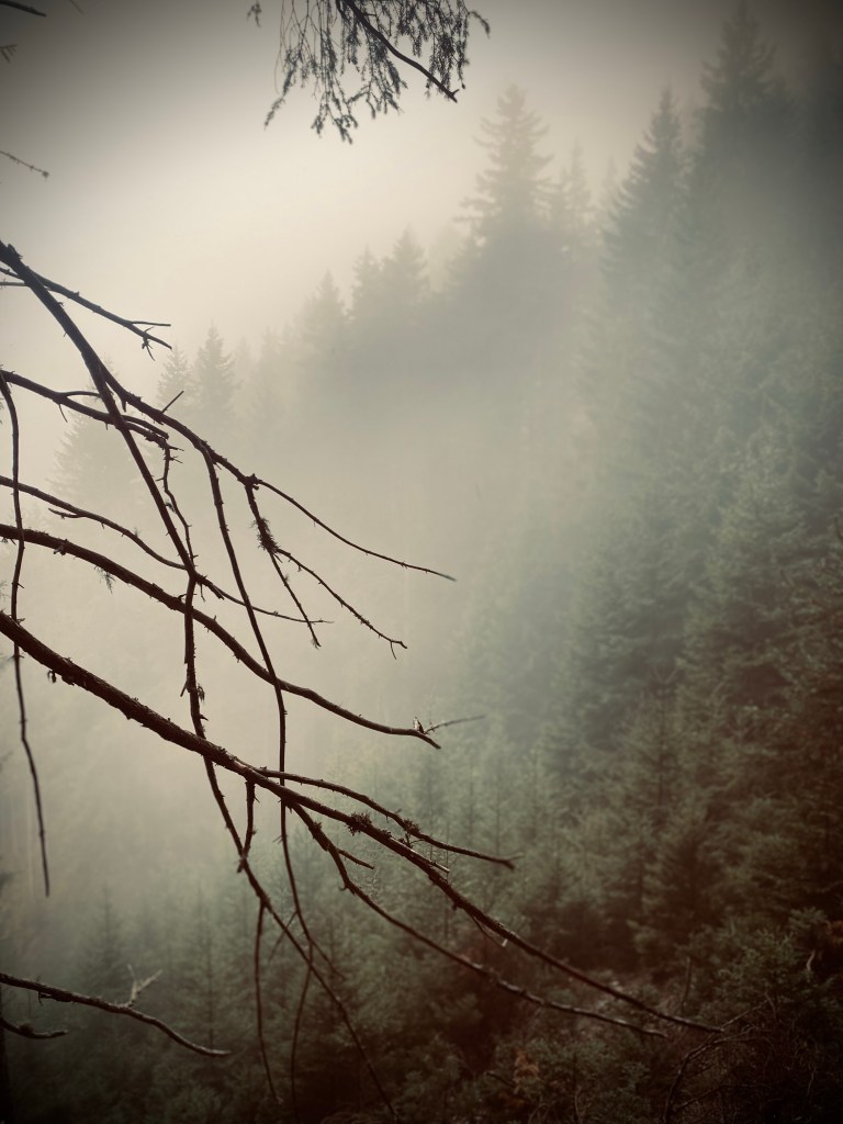 Und hier passierte es. Ein Steinadler segelte über meinen Kopf hinweg und verschwand so schnell, wie er gekommen war, auch schon wieder im Nebel, tauchte dann noch einmal kurz auf und ließ sich auf einem zu weit entferntem Felsen nieder. Leider habe ich das Handy nicht schnell genug in den Händen gehabt – diese wunderbare Begegnung gehört also nur mir allein. Immerhin habe ich aber seinen unverkennbaren Ruf aufzeichnen können, denn der schallte noch einige Mal über das Tal.