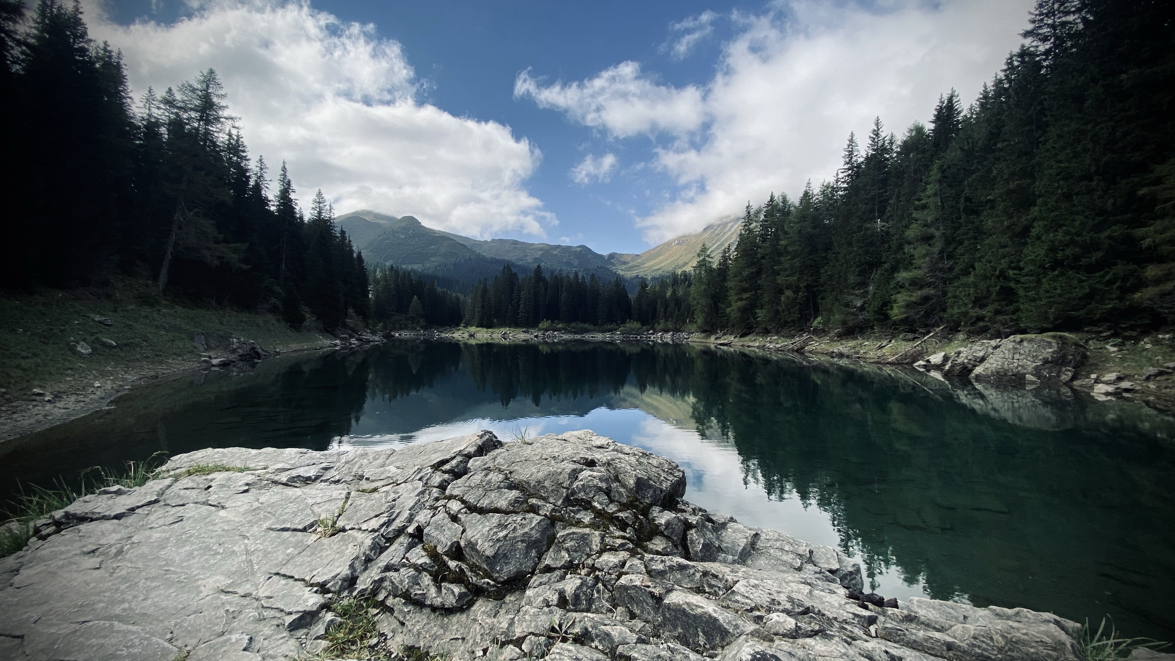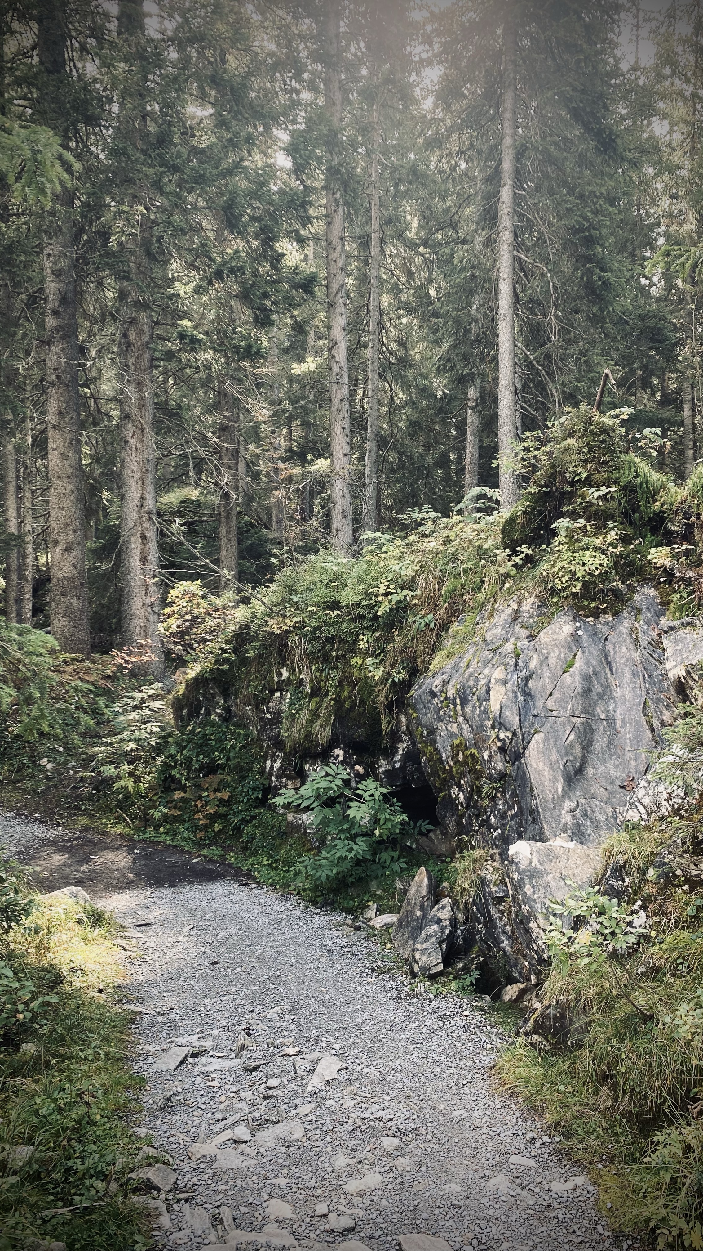 Nun ging es erst einmal rechts auf einen Waldweg am See vorbei, der gesäumt von großen Felsen und üppiger Natur bis zur Seekapelle „Maria am See“ führt. Sonnenstrahlen tanzten über Wasser und moosbewachsene Felsen und schufen zusammen mit dem Ausblick einfach eine tolle Stimmung. Unterhalb der kleinen Kapelle erreichten wir schließlich eine Holzbrücke, über die wir das gegenüberliegende Seeufer erreichten.