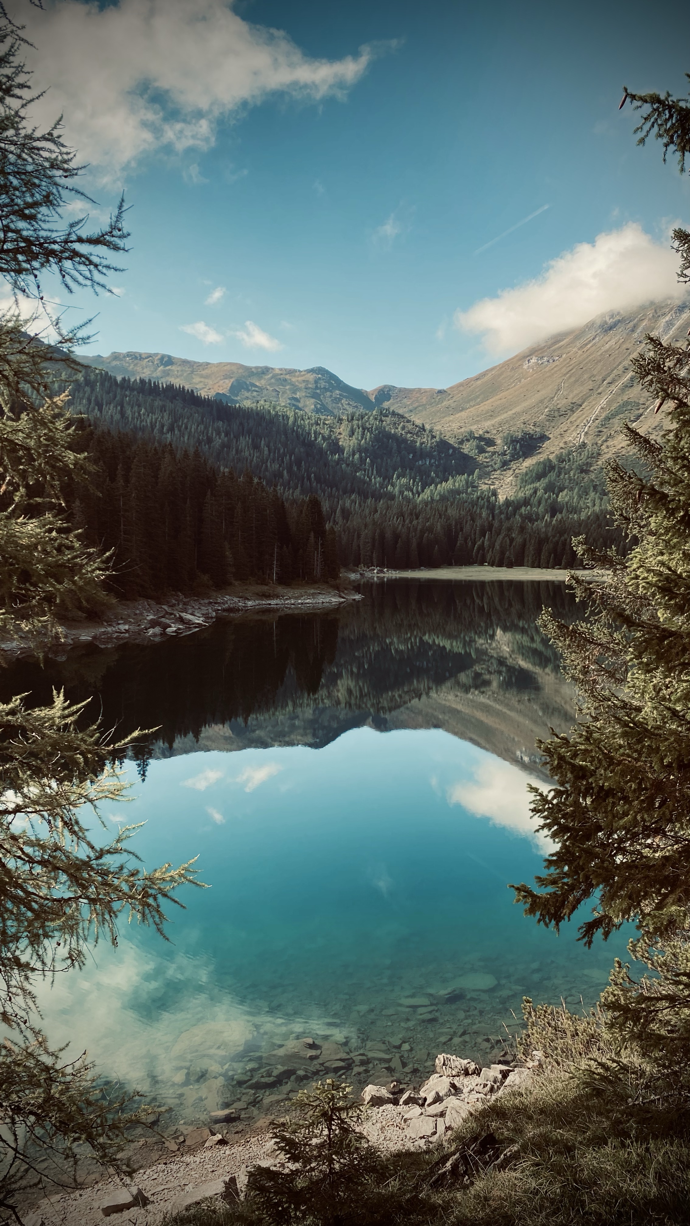 Die Freiweide verdichtete sich zu einem lichten Kiefernwald, den man auf einem Forstweg oder wie wir auf kleinen Trampelpfaden links vom Weg durchquert. Dabei unbedingt die rot-weißen Markierungen im Auge behalten, um auf dem richtigen Weg zu bleiben. Nach Verlassen des Waldes folgten wir den Wegweisern zum Obernberger See. Ab hier geht es eine Weile bergauf, doch oben angekommen, hat man einen wunderbaren Blick auf den ersten Teil des Sees. Große Felsen, glasklares Wasser, in dem sich die Berge und der blaue Himmel spiegeln, entschädigen uneingeschränkt für den kurzen Anstieg.