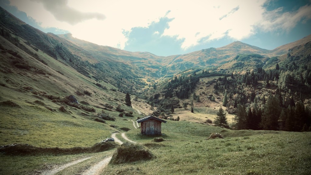 Hier tauchte dann auch schon rechter Hand die Vallmingalm auf, die neben Kaiserschmarren auch hausgemachten Käse und frische Milch anbietet. Da das Wetter langsam zu kippen drohte, wollte ich so schnell wie möglich weiterlaufen, den Käse dort aber dennoch probieren. Die Hüttenwirtin war freundlich und spontan und packte sofort ein Stück ihres Käses und ein paar Scheiben Brot für uns ein. So konnten Ginger und ich uns schnell wieder auf den Weg Richtung Roßkopf-Bergstation machen, unserem geplant höchsten Punkt unserer heutigen und damit letzten Etappe.